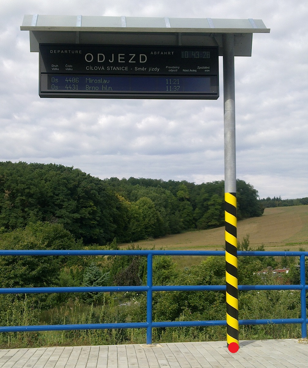 | Poznámka: | Pro mapování se malé informační tabule zavěšené v podchodech, nadchodech a pod střechou nástupiště obvykle neměří. Pro G-DSPS se měří.