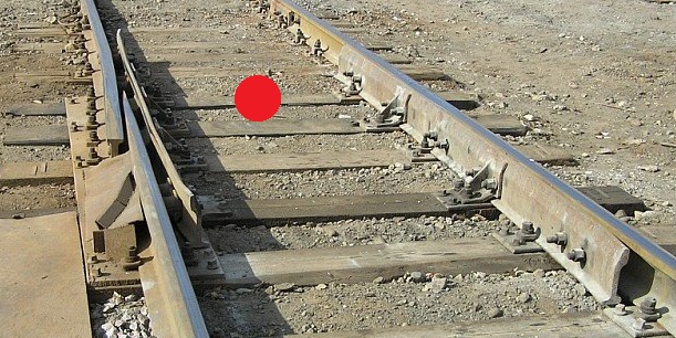 | Měřit v terénu: | Měřit u vnitřního hrotu na rozchodku v ose koleje, výškově v nepřevýšeném kolejnicovém pásu. |