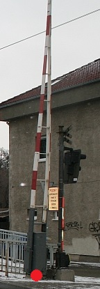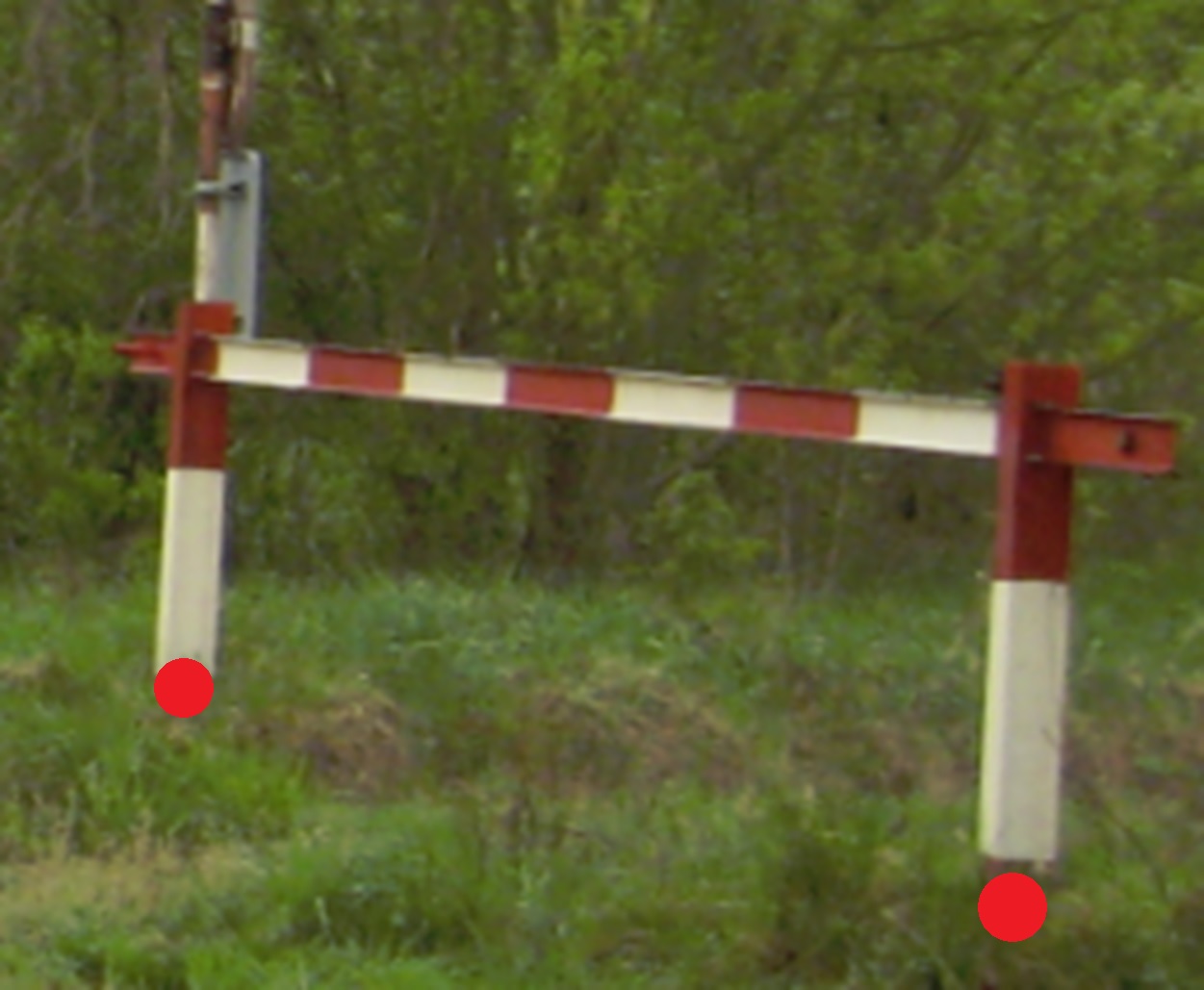 Prostrkávací závora - zaměřit oba sloupky závory. Na pravý sloupek ve směru jízdy auta umístit značku závory, sloupek na druhé straně cesty kreslit pomocí DM 60050 "Střed předmětu malého rozsahu" s popisem "sloupek".
