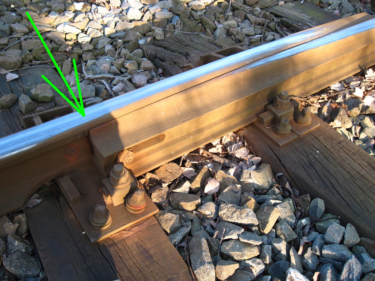 | Měřit v terénu: | Zaměřit na rozchodku konec pohyblivé kolejnice v ose koleje, výšku určit k nepřevýšenému kolejnicovému pásu.