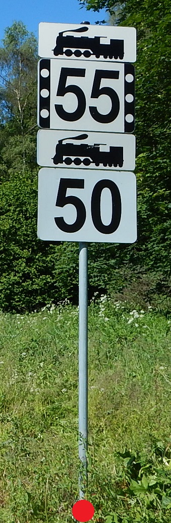 | Název: | Návěst Traťová rychlost Rychlostník N 1.horní (bílá deska) s pruhy a s tabulkou s černým obrazem lokomotivy na Rychlostníku N s černým obrazem lokomotivy s podstavcem |