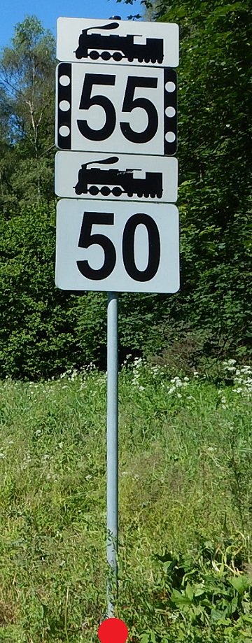 Název:Návěst Traťová rychlost Rychlostník N (bílá deska) s černým obrazem lokomotivy s podstavcem