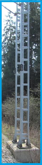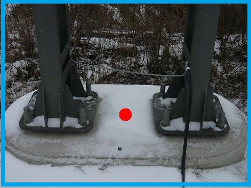 | Pomocné: | Druhá a třetí fotografie (modrý rámeček) - zvláštní případ = dvě samostatné trakční podpěry ocelové jednoduchého profilu umístěné na jedné patce a s jediným číslem TP. Neopírají se jedna o druhou a vzdálenost jejich pat nepřesáhne 1 m. Měřit jako by to byla jedna příhradová podpěra = jedním bodem uprostřed, výškově na soklu. Značku natáčet rovnoběžně s osou koleje ve směru kilometráže. V popisu bodu uvést rozlišení, např. "2TP-I profil". |
