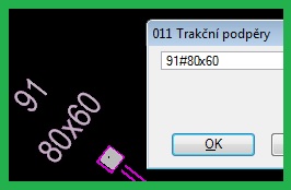 Zeleně ohraničený obrázek zakreslení - u některých G-DSPS se objevil výslovný požadavek ze stavby psát do výkresu DGN i rozměry příhradových TP - v tom případě lze použít textový uzel. |