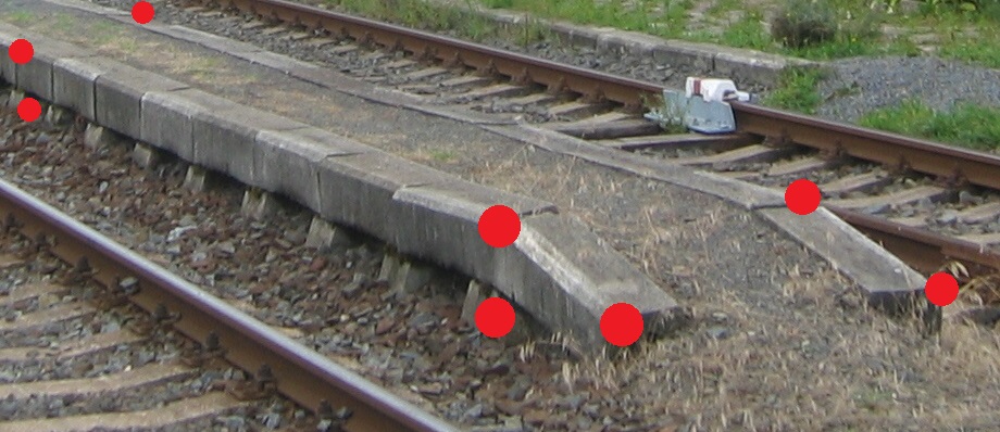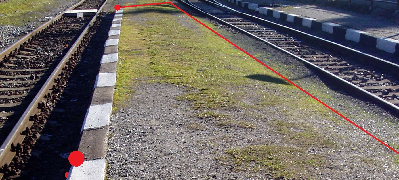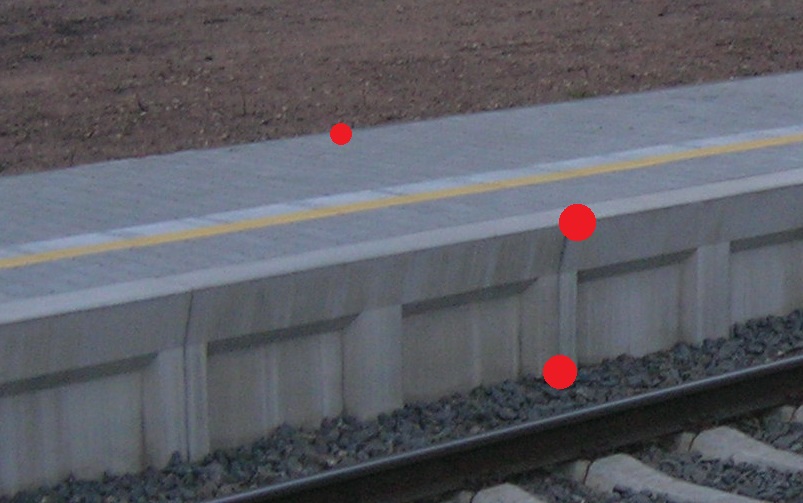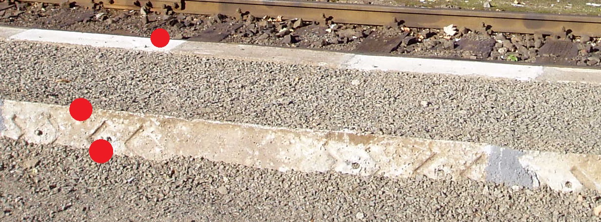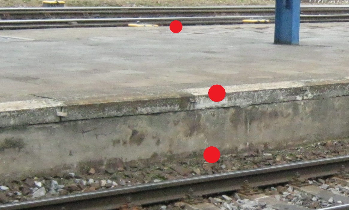 | Měřit v terénu: | Zaměřit všechny lomové body nahoře a spodek nástupiště = průnik s terénem nebo štěrkovým ložem. V případě nástupiště v oblouku měřit v profilech s osou koleje. U zkosených hran nástupišť měřit fiktivní hranu = skutečnou výšku a polohu nástupiště (viz M20/MP004), pokud možno naproti měřenému bodu osy koleje. |