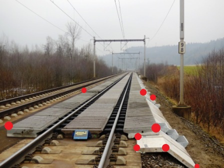 | Měřit v terénu: | Zaměřit obvodem nahoře, případně jako 3D objekt. (V oblouku/přechodnici je vhodné měřit v profilech v místech, kde je brána osa koleje.) |