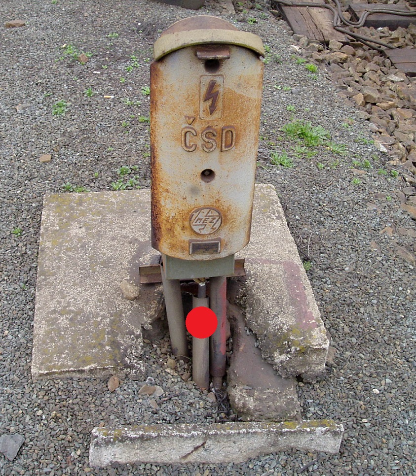 | Pomocné: | Žlutě orámované fotografie - kab.objekt (žlutá krabička) se velmi podobá vysílači u snímače počítače náprav, ale na fotografii je vidět, že kabely vedou ke svorkám na kolejnicích = v tomto konkrétním případě je to elektro objekt (pasívní ochrana před atmosférickým přepětím = uzemnění kolejnic před blesky). Měřit krabičku. Svorky na kolejnici ani kabely mezi svorkami a žlutou krabičkou neměřit.) Totéž druhá orámovaná fotografie. Ještě k první žlutě orámované fotografii - obdobné krabičky a svorky na kolejnici mohou sloužit i jako DM 10117 Konec kolejového obvodu a laik jejich funkci nedokáže odhadnout, jedině podle popisu. Krabice často nejsou popsané a mohou být také černé. V G-DSPS vím co měřím, v mapování je nutno se řídit popisem. Pokud popis není, nějak se rozhodnout, správci si to přeberou. |