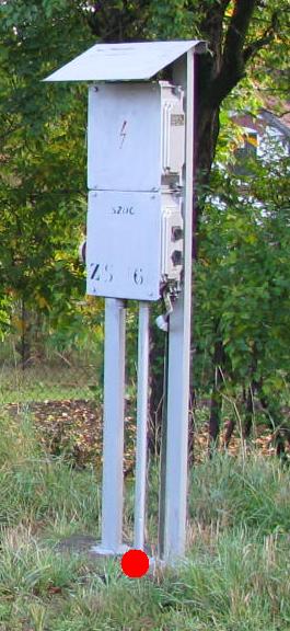 | Měřit v terénu: | Malé zásuvkové skříně - zaměřit středem výškově na soklu/terénu. Drobné, malé objekty (s výškou do 0,5 m), různé krabičky apod. změřit jedním bodem středem na temeni zařízení. Čidlo pro ovládání osvětlení upevněné na zdi budovy (viz foto) měřit odrazem od spodku krabičky. |