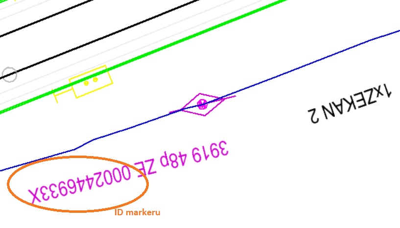 Nově se objevují markery s RFID (markery s identifikačním číslem). Tato čísla se na základě požadavku objednavatele a podle domluvy na stavbě uvádí také do výkresové dokumentace - viz ukázka zákresu.